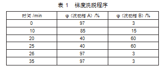 色谱条件:色谱柱为DIKMA Diamosil C18(2),5μm,4.6 mm×250 mm;流动相A为pH=3.6缓冲液:分别取磷酸氢二钠约2.3 g和枸橼酸约1.4 g,加水溶解,并稀释至1 L,用磷酸调pH值至3.6,流动相B为乙腈,按表1进行梯度洗脱;检测波长254 nm;流速0.8 mL/min;柱温40℃;进样量20μL。