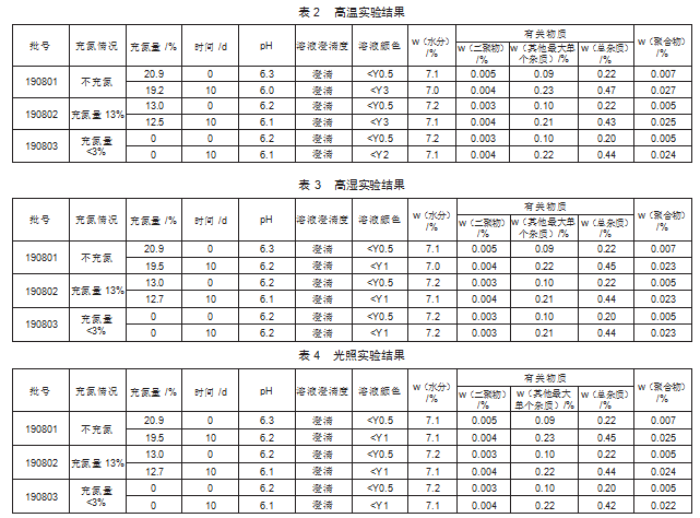 通过对不同充氮量样品进行影响因素试验质量考察,结果表明,在高温放置10 d,pH由6.3变化至变化至6.1,呈下降趋势,溶液颜色不充氮与充氮量13%样品均变化至<Y3,充氮量<3%样品变化至<Y2,有关物质中其他最大单个杂质质量分数均增长0.1%,总杂质质量分数增长0.2%;聚合物质量分数均增长0.02%;其余指标无明显变化,且所有检测项均在限度内,各指标变化趋势一致;在高湿和光照放置10 d,不同充氮量样品各指标变化趋势不明显,本品在此条件下较稳定。