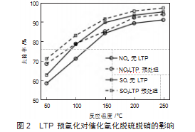 LTP预氧化作用对催化氧化脱硫脱硝性能的影响结果见图2。