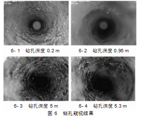 运用钻孔探测技术对东周窑煤矿61612工作面辅运巷煤柱内部的裂隙分布状况进行全面分析可知,如图6所示,在距离钻孔起始点0.2 m的范围内,裂隙特征极为明显,展现出显著的局部破坏特征。随着钻孔向更深层次的推进,当进入0.95~5 m的深度区间时,煤壁上的裂隙数量逐渐减少,煤壁的损伤程度及裂隙的可辨识性均有所降低,但仍能发现一些微小的裂隙存在。而当钻孔深度超过5 m时,煤体内尽管仍有裂隙零星分布,但这些裂隙的显现已经变得较为隐约,煤柱内部在整体上保持了良好的结构稳固性。