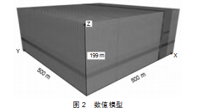以东周窑煤矿61610工作面为基础,构建三维数值模拟模型,其三维可视化效果如图2所示。此模型在X轴方向上500 m,Y轴方向同样500 m,而Z轴方向则199 m。在此模型中,X轴表征工作面的倾斜特征,Y轴则表征工作面的推进趋势。61610工作面的倾斜幅度为255 m,推进距离为300 m,且其开采的煤层厚度设定为25 m。