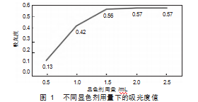 设置显色剂用量分别为0.5、1.0、1.5、2.0、2.5 mL,其他实验条件保持一致,实验结果如图1所示: