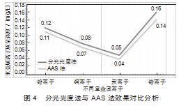 为了验证分光光度法在石油化工污水中重金属离子检测中的实际应用效果,本研究选取了某石化厂污水处理站的出水样品进行案例实践分析。该厂污水处理站主要处理含铅、镉、汞、铬等重金属离子的工业污水,处理后的出水需符合国家排放标准。本研究采用优化后的实验条件(显色剂用量1.0 mL、反应时间10 min、pH=7.0)对出水样品中的重金属离子进行检测,并与传统原子吸收光谱法(AAS)的检测结果进行对比,具体情况如下图4所示。