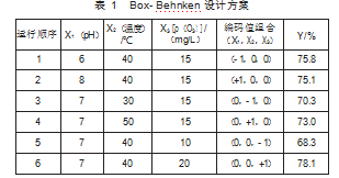 Box-Behnken设计是一种响应面方法(RSM)中的实验设计,适用于构建二次多项式模型。Box-Behnken设计避免了极端值组合[如全(-1)或全(+1)],适用于探索曲面响应的平缓区域。本研究采用三因素三水平Box-Behnken设计的实验方案,且实验次数较少。该方案共包含6组实验(3组因子组合+3组中心点重复),用于构建二次多项式模型。变量采用编码值(-1,0,+1)与实际值对照,COD去除率为实验观测值(Y),具体的实验实际方案如表1所示。