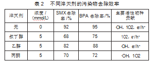 表2显示,无淬灭剂时SMX和BPA去除率分别为92%和95%。加入叔丁醇后去除率降至68%和75%,表明·OH起重要作用;加乙醇后去除率略有下降,说明1O2有一定贡献;而丙酮对去除率影响小,表明·O2-作用有限。