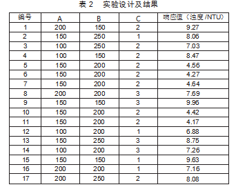 基于单因素实验结果,选取搅拌速度、聚合氯化铝(PAC)用量和阴离子型聚丙烯酰胺(APAM)用量为主要影响因素,采用Box-Behnken实验设计方法,而后使用Design-Expert 8.0软件,结合矿井水的具体处理条件,开展响应曲面优化分析。在参数选择上,自变量设置为:搅拌速度(100~200 r/min);PAC用量(150~250 mg/L);APAM用量(1~3 mg/L),响应值设置为浊度,以此生成17组实验方案,因子编码及水平如表1所示。