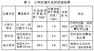 对比三种处理方法的试验结果,如表4所示。化学沉淀法在Ca(OH)2投加量为0.3 g时,氟离子质量浓度由98.5 mg/L降至1.8 mg/L,去除率达到98.2%,且操作简单。但沉淀剂过量会导致溶液pH值升高至12.1,需额外进行中和处理。吸附法在活性炭投加量为3 g/L时,氟离子质量浓度降至5.2 mg/L,去除率为94.7%,效果略低于化学沉淀法。但无需调节pH值,吸附饱与后需再生处理。电化学法在电压为6 V、电解30 min条件下,氟离子质量浓度降至3.6 mg/L,去除率为96.3%,能耗为0.32 kW·h/m3,具有高效性、经济性,但设备成本较高。从处理效率看,化学沉淀法最佳,电化学法次之,吸附法相对较低。从经济性、适用性看,电化学法最具综合优势,吸附法适用于低质量浓度氟废水处理,化学沉淀法适用高质量浓度废水。