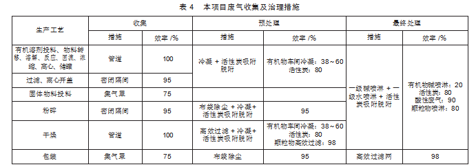 本案例各生产环节均在密闭的设备或密闭隔间内进行,液体原料投料及物料转移均采用密闭管道连接,涉及有机溶剂的设备自带冷凝器,涉及含尘废气的设备均配备高效除尘装置,不凝气或经处理后的含尘废气通过管道收集进入废气处理系统。