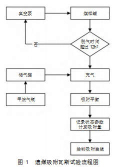 在试验期间通过对甲烷注气量和游离量的计算分析煤样对甲烷气体的吸附量,由此分析环境温度对遗煤吸附瓦斯特性的具体影响[4]。试验流程具体情况如图1所示。