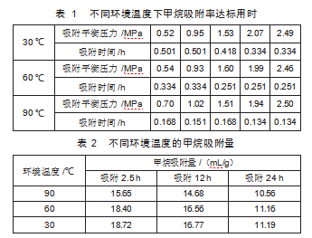 对不同环境温度条件下达到相应的甲烷吸附率需要的时间分析,以甲烷吸附率达到50%标准为例,具体情况如表1所示。