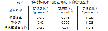 如图1所示,可以看出直观的数据对比,镍基合金在高温氧化和高温硫化环境中展现了较强的抗腐蚀能力,这与其优异的高温稳定性和较高的耐硫化性有关。陶瓷基复合材料在高温氯化环境中表现优异,表明其表面结构对氯化物的防护作用较强。相比之下,不锈钢在所有腐蚀环境中表现较为平庸,尤其是在高温硫化和氧化环境中,其耐腐蚀性较弱,这是由于钢基材的脆弱性以及表面钝化膜的损耗。