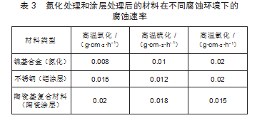 本实验通过对比不同表面处理方法对高温材料的耐腐蚀性能的改善效果,探讨表面处理在实际应用中的可行性和效果。实验主要采用了两种表面处理方法:氮化处理和涂层处理。氮化处理通过在高温环境下将氮气引入材料表面,形成氮化层,增强材料表面的硬度和耐磨性。由表3可得,在高温氧化和硫化环境中,氮化处理能够显著降低材料的腐蚀速率。以镍基合金为例,经过氮化处理后,其在高温氧化环境中的腐蚀速率由0.012 g/(cm2·h)降至0.008 g/(cm2·h),显示出明显的耐腐蚀性能提升;涂层处理则是通过在材料表面涂覆一层抗腐蚀性强的涂层,如铝涂层或陶瓷涂层,形成一道物理屏障,防止腐蚀介质与材料直接接触。铝涂层和陶瓷涂层在实验中表现出较好的耐腐蚀效果,尤其是在高温硫化环境下,铝涂层材料的腐蚀速率从0.020 g/(cm2·h)降低至0.012 g/(cm2·h),陶瓷涂层则从0.035 g/(cm2·h)降低至0.018 g/(cm2·h)。