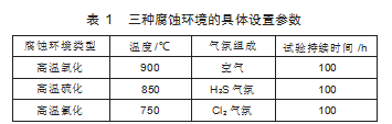 如表1所示,为模拟石油化工配管在高温环境中的实际腐蚀情况,本实验设置了三种典型的腐蚀环境:高温氧化环境、高温硫化环境和高温氯化环境。这些环境能够有效地模拟石油化工领域中常见的腐蚀条件,帮助评估不同处理技术对高温材料耐腐蚀性能的改善效果。在高温氧化环境下,实验样品暴露于900℃的空气中,模拟氧气在高温下对材料的氧化作用。该环境适用于分析材料在空气中长时间暴露的腐蚀行为。对于高温硫化环境,实验样品暴露在850℃的H2S气氛中,模拟酸性气体对材料的侵蚀;在高温氯化环境下,实验样品在750℃的Cl2气氛中进行腐蚀模拟,主要用于分析材料在氯化环境中的耐腐蚀性能,尤其是对氯化腐蚀敏感的金属材料。