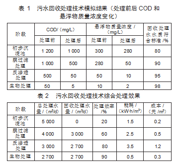 污水回收处理技术模拟结果和综合处理效果分别见表1和表2。