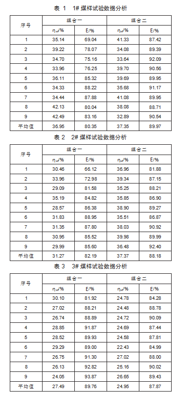 对三组煤样和两种试验药剂的结果分析,具体情况如下表1—表3所示。