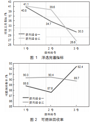 通过数据综合分析可知,药剂组合二与药剂组合一相比,浮选完善指标和可燃体回收率的综合表现相对较小,浮选效果更佳。