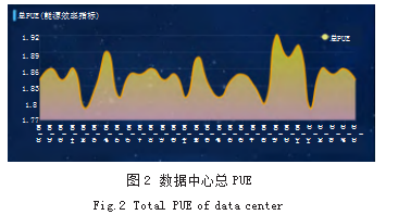 观察得知,数据中心近一个月PUE在1.79到1.92之间,平均值为1.85,有较小的起伏,可能由于工作量的增加或减少,机器能耗略有改变。但是2023年度国家绿色数据中心PUE平均值为1.26,该数据中心PUE数值高于国家平均值,体现出该数据中心IT设备耗能越多,即能效水平较低,与国家平均水平还有一定差距。