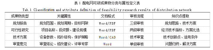 该模块负责配电网可研成果物的分类、存储和检索。成果物主要包括四大类,如表1所示,每类成果物具有不同的结构特征和管理要求。规划报告通常包含规划范围、规划周期和目标网架等核心内容,需要三级审核流程:可行性研究报告侧重项目名称、投资额和建设规模等要素;技术方案详细描述设备参数、拓扑结构和保护策略;审查意见则包含审查结论和修改建议[4]。
