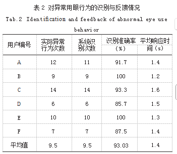 为了进一步分析系统对用户行为的识别能力,选取6名学生在阅读活动中佩戴设备进行1小时使用测试,记录系统对异常用眼行为的识别与反馈情况。结果如表2所示。