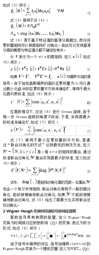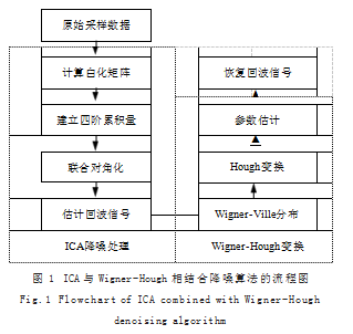 独立分量分析(ICA)基于高阶统计量的特征提取方法,能够有效获取相互独立的信源量化特征,ICA被认为是PCA的高阶扩展[1],仅从观测数据的统计信息出发,实现传输信道的辨识及信源的估计。Herault和Jutten等人最早提出了一种基于反馈神经网络的ICA方法,实现了两个独立信源的分离[2]。Cardoso着重研究了高阶累积量的ICA方法,并最终形成易于实现的特征矩阵联合近似对角化(JADE)算法[3]。Cmon系统地阐述和研究了ICA问题,并提出了ICA概念以及基于最小互信息的目标函数[4]。在此基础上,许多学者提出了不同的算法,Bell和Sejnowski通过研究最优非线性函数与信源概率密度函数的关系,提出了一种基于前向网络结构和信息传输最大化的Infomax算法[5]。Kiyotoshi和Matsuoka提出了一种分离非平稳信号的算法[6],从而把ICA问题的研究工作向实际应用推进了一大步。Oja提出了一种固定点迭代的FASTICA算法[7],该算法具有工程上易于实现、计算效率极高等特点,解决了众多实际问题。时频分析方法着眼于非平稳信号的时间和频率特征,将一维的信号扩展到二维的时间和频率参数平面上进行观察,从而获得信号频率随时间的变化特征。Gabor最早提出了利用时间和频率两个变量联合对信号进行描述,为时间和频率联合域内的信号分析奠定了基础[8]。在此之后,Avargel和Cohen等人提出了短时傅里叶变换[9],该变换是一种利用窗函数在信号的时间轴上滑动的分析方法。Wigner在量子力学中提出了著名的Wigner分布[10],后来由Ville将其引入信号处理领域,从而形成了完整意义上的双线性时频分析方法的基础,即Wigner-Ville分布。Hough从图形特征分析的角度出发,提出了Hough变换,研究人员将其应用到Wigner-Ville分布的时频平面,形成了Wigner-Hough变换[11],Wigner-Hough变换已经成为信号处理、遥感遥测等许多领域使用的重要工具。