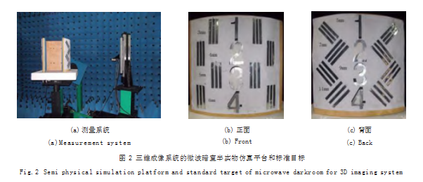 为了验证成像系统的成像质量以及系统分辨率,设计了标准目标如图2所示。标准目标采用了木质结构作为支撑体,分别将测试分辨率和清晰度的金属条贴于结构体两侧,吸波材料贴在结构体的非目标区域,减小构体两侧目标彼此之间的干扰以及目标和周围环境彼此之间的干扰。用宽度为1 cm的铝箔设计数字“1”“2”“3”“4”来验证系统成像的清晰度。使用图2(b)中的金属线条来验证系统沿着X方向的分辨率,垂直排列的线条宽度为1cm,长度为10cm,间距分别为3mm、4mm、5mm、6mm,结构体弧度较小,Y方向的分量忽略不计。使用图2(c)中的金属线条来验证沿着X、Z两个方向的联合分辨率,金属线条的长宽不变,只是排列方式变为与X轴成±45°的排列,间距分别是5mm、7mm、9mm、11mm。