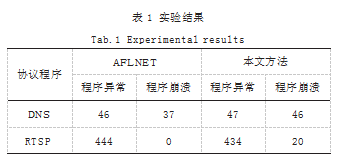 本次实验基于Linux系统,通过搭建仿真服务器模拟处理协议数据服务,选择RSTP、DNS协议的实体程序进行测试,评估该方法挖掘漏洞的能力。实验结果如表1所示。