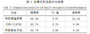将所提方法与传统阈值策略及深度学习基线模型(CNN-LSTM)进行性能对比,评价指标包括准确率(Accuracy)、F1值与误报率(False Alarm Rate),结果如表3所示。