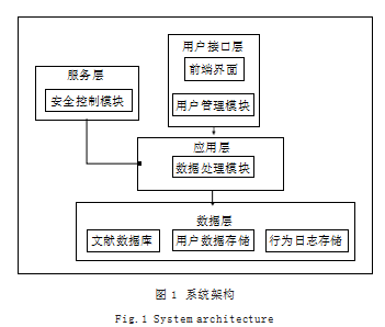 本系统采用分层架构设计,分为用户接口层、应用层、服务层和数据层。用户接口层包含前端界面和用户管理模块,负责与用户的交互以及用户的身份验证和权限管理。应用层包括数据处理模块,负责分析用户的行为数据,并基于此生成个性化的文献推荐。服务层主要包括安全控制模块,负责对系统的数据进行加密保护,确保数据传输的安全性,并管理访问权限[3]。数据层由文献数据库、用户数据存储和行为日志存储组成,负责存储和管理系统的文献、用户信息以及用户行为记录,确保数据的安全性和高可用性。通过这种分层架构,系统能够实现模块化设计,可扩展性、可维护性与安全性得到了提高。系统架构如图1所示。