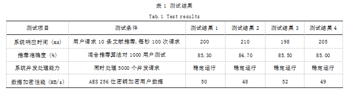 为了验证系统的性能,本文进行了多次测试,涵盖系统响应时间、推荐准确度、并发处理能力以及数据加密性能。各项测试的结果如表1所示。