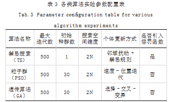 为验证所提出的基于禁忌搜索算法的通信覆盖优化方法在不同网络部署策略下的适用性与优化性能,本文设计并构建了统一的仿真实验平台。实验在一套运行于Ubuntu 20.04系统的高性能计算节点上完成,采用Python语言及NumPy、Matplotlib等科学计算库实现算法模块。仿真区域为二维100m×100m平面区域,节点通信半径设定为15m,节点总数为10。为确保结果的对比有效性,引入传统的粒子群算法(PSO)与遗传算法(GA)作为对比方法,采用一致的目标函数与边界条件进行同步测试,所有算法均在相同迭代次数与初始解数目下运行。考虑算法的收敛效率与稳定性,设置每组实验独立运行30次,并对收敛轮数、最终目标函数值与冗余覆盖率进行记录。各类算法对应的主要实验参数配置及对比关系如表3所示。