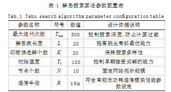 在禁忌搜索算法用于通信覆盖优化的设计过程中,关键参数的选取对全局搜索性能具有决定性作用。设置最大迭代次数Tmax=500,用于限制搜索步数并控制计算资源消耗;禁忌表长度L=20,平衡局部搜索陷阱规避与信息保持能力;每轮迭代中生成的候选邻域解个数设为K=30,以维持解空间多样性[2];初始温度参数用于接受劣解的概率控制,设定为T0=100,随迭代呈指数衰减。通信模型中的节点数N固定为10,通信半径R=15米,部署区域大小为100×100米。参数配置如表1所示,所有参数均结合网络场景规模及仿真计算能力设定,以保证搜索收敛性与实际工程适用性。