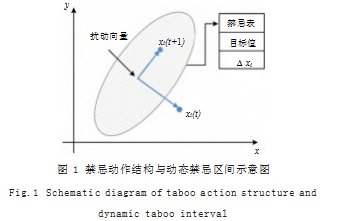 在禁忌搜索过程中,为有效避免陷入局部最优且提升解空间的探索深度,需设计适用于节点空间扰动问题的动态禁忌规则。考虑到通信覆盖优化中的解向量X={x1,x2,...,xN}为连续空间中多维实数向量,传统的基于离散状态或路径的禁忌机制不再适用。为此,采用扰动向量禁忌编码机制,即将每一轮扰动动作以Δxi=xi(t+1)−xi(t)的形式存入禁忌表T,并设置动态禁忌长度Lt∈[15,25],其值随当前搜索状态的收敛速率调整。当连续若干轮无明显增益时,通过增加Lt扩大禁忌范围,从而强化跳出局部能力;而在解集活跃期则减小Lt,保留更多变异路径以利于局部精细搜索。此外,引入目标值—扰动向量二元映射结构作为禁忌表项存储结构,使得禁忌控制不再仅基于位置相似性,而综合考虑扰动方向与全局目标的相对改善情况。禁忌动作的存储结构与禁忌区间在解空间中的覆盖示意图如图1所示,反映出禁忌机制对解空间路径演化的约束作用。