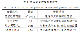 每个节点位置xi=(x,x)的选取满足约束xi∈S,并通过控制最小间距dmin≥2R实现基础退避机制,防止节点重叠。初始解构造参数设置如表2所示。