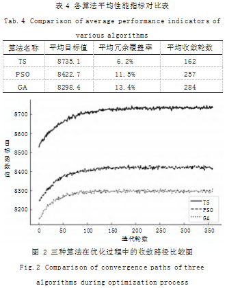 在统一实验环境与参数配置下,以节点覆盖有效面积最大化为目标,结合冗余度抑制机制,分别记录三种算法在30轮独立实验中的平均最优值、平均冗余覆盖率及收敛迭代轮数。结果显示,禁忌搜索在保持覆盖面积优势的同时,有效降低了区域冗余重叠,其平均目标函数值优于其他两种算法,收敛速度亦更具稳定性。三类算法在实验中的关键性能指标对比如表4所示,可以看出,禁忌搜索在冗余率控制方面具有显著优势,平均冗余覆盖率为6.2%,而PSO与GA分别达到11.5%与13.4%。其平均收敛轮数控制在162轮以内,较PSO快约37%,反映出邻域扰动与动态禁忌机制在搜索路径控制中的高效性。进一步绘制收敛过程,如图2所示,三条算法曲线清晰地反映出了在前150轮内的目标值演化趋势,其中禁忌搜索收敛路径更加平滑,表明其全局搜索与局部跳出能力的协调性更佳。