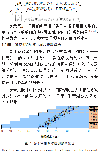 相对于传统CCA算法在利用SSVEP信号谐波成分方面的局限性,FBCCA算法能够更全面地分析包括基频、低频及高频谐波在内的信号成分[10]。FBCCA算法包含以下3个主要步骤:(1)滤波器组分析;(2)SSVEP子频带成分与正余弦参考信号的CCA算法;(3)目标识别。FBCCA算法通过设计N个滤波器组,将EEG信号分解成N个子带,以提取各频带的基频及谐波信息,并计算各子带与对应频率正余弦参考信号的典型相关系数。对于第i个刺激频率,特征向量的定义如式(1)所示:
