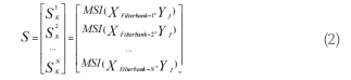 在本研究中,子带数N为7,子带的下截止频率为10*N Hz,子带的上截止频率为130Hz时获得效果最好。计算子带信号与正余弦参考信号的同步指标。针对第k个目标刺激频率,其同步指标向量S由N个子带的计算结果构成,如式(2)所示: