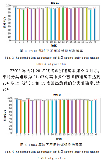FBMSI算法对20名被试识别准确率结果如图4所示,平均分类准确率为92.38%。被试1和4准确率达95%。该算法准确率相比FBCCA算法有一定的提升。基于FBMSI算法构建的脑电信号分类模型展现出稳健的个体适配能力。算法稳定性分析表明,大多数被试准确率在90%~94%之间,多个被试在SSVEP任务中表现出色,这些被试的识别表现、稳定的准确率区间以及个体性能的提升为后续优化算法参数、探索个体差异机制以及筛选高性能被试群体提供了重要的实证依据。实验结果表明,FBMSI算法在多数被试中展现出稳定的分类性能,但个体差异导致的准确率波动问题仍需通过自适应参数调节等策略进一步优化。