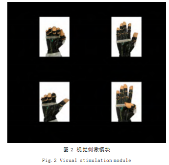 设计的刺激分类为四种,分别对应四种不同的康复动作。刺激呈现在具有120Hz刷新率的三星显示器上,基于MATLAB的Psychtoolbox工具箱进行程序开发。该工具箱可以精确控制视觉刺激频率,刺激频率选择为30Hz(五指弯曲)、34Hz(五指伸展)、38Hz(大拇指弯曲)和42Hz(大拇指伸展),设计的刺激界面如图2所示。