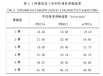 由表1可见,目标识别的准确率随导联数量增加而提升。eTRCA算法在8导时表现最优,准确率达95.15%,较1导准确率提高约25%。与FBCCA和FBMSI算法相比,该算法分别提高约8%和3%。表2数据表明,平均信息传输率与导联数呈正相关,3种算法的信息传输速率均在8导时最高。此时,eTRCA算法的信息传输率显著优于另外两算法,为44.58bits/min。对比1、2、3不同导联组合的结果,在采用1导(O2)时的准确率高于3导联组合(PO5、PO6、POz),表明提升SSVEP识别精度的关键在于导联位置的精准度,而非单纯增加导联数量。