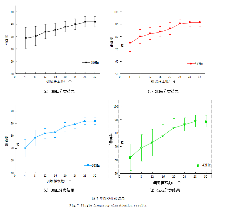 不同刺激频率(30Hz、4Hz、34Hz、47Hz)下分类结果随训练样本数量的变化趋势如图7所示。整体而言,四种频率的识别准确率均呈现随训练样本数增加而显著提升的趋势,这表明eTRCA算法的准确率对训练数据样本量存在依赖性。具体来看,30Hz在几乎整个样本量区间都展现出最高的识别准确率,显著优于其他频率,凸显出该频率下SSVEP信号特征具有更高的可识别性。相比之下,42Hz下,准确率虽然也随样本增加而提高,但其增长幅度最为平缓,且整体准确率水平低于30Hz,这反映了高频段SSVEP中,被试间的个体差异和训练样本较少时,算法的实际表现较差。然而,随着训练样本量的增大,分类准确度逐步提升并最终稳定在较高水准。34Hz与38Hz的表现介于两者之间,同样受益于样本量的扩充,达到了较高的最终准确率。图中各数据点上的误差棒表明了结果的波动范围,进一步表明充分训练样本对于稳定提升系统性能的关键作用。该结果对于实际应用中优化系统参数设计具有重要的指导意义。