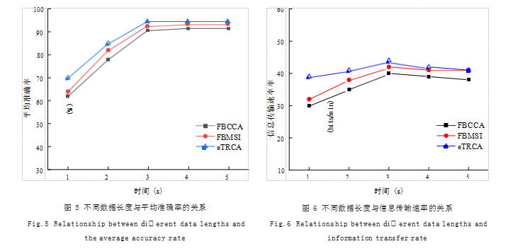 不同数据长度下平均正确率与信息传输速率的关系如图5所示,整体平均正确率随着数据长度的增加而提高,在3s后趋于平稳。在数据长度为1~3秒时,eTRCA算法的正确率明显高于FBCCA,随着数据长度的增加,两种算法的准确率相差逐渐减少。如图6所示,eTRCA算法的准确率在1~3秒内相对于另外两种算法显著提高。在任何数据长度时,准确率都要优于FBCCA和FBMSI算法。数据长度为3秒时,eTRCA算法的准确率达95.35%,比FBCCA和FBMSI分别提高11%和6%。随着时间长度的增加,三种算法的准确率都逐步上升,并逐渐趋于最高准确率。1~3秒时,信息传输速率逐渐上升,3秒后,数据传输速率缓慢下降,3种算法的信息传输速率均在第3秒时达到最大值。在3秒的数据长度下,eTRCA的信息传输速率达43.84bits/min,明显优于其它算法。