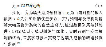 式中,t为喷头磨损预测值;xt为当前时刻的输入数据;θ为训练后的模型参数。实时预测与反馈机制能够大幅度提升系统的自适应能力,通过数据采集与预处理、LSTM模型、模型训练与优化、实时预测与反馈机制的结合,深度学习技术实现了对喷头磨损的精准预测与监测[5]。