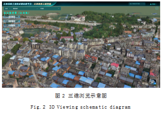 基于空间大数据可视化技术[6],针对国土调查成果中的矢量数据与影像数据,综合利用矢量切片渲染、实景建模、数字高程模型等方法,构建二维平面与三维立体一体化的数字环境,支持二三维视图联动、数据互操作与融合分析,实现从全局统计到细节研判、从平面管理到空间分析的无缝转换,全面提升数据洞察力与决策支持能力。三维浏览示意图如图2所示。