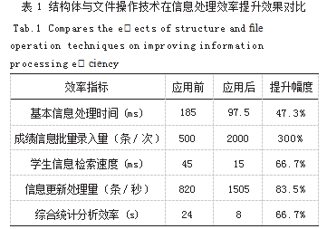 学生信息管理系统在结构体与文件操作技术的结合应用下,信息处理效率获得全面提升。通过对系统在日常信息处理各环节的效率指标进行测量,收集了技术应用前后的效率提升数据,充分展现了双重技术在提升信息处理效率方面的显著成效,如表1所示。