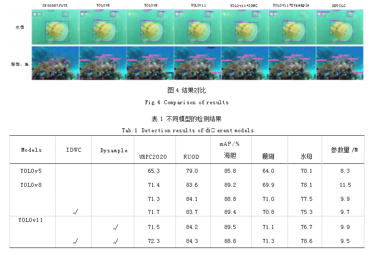 摘要:随着海洋资源开发与生态监测需求的日益增长,针对水下生物的识别检测成为海洋探测技术的核心环节。然而,水下环境存在色差色偏等问题,导致传统目标检测模型在水下场景中性能衰减显著。针对这一情况,本文提出基于YOLOv11的改进模型,在骨干网络(backbone)的C3k2模块中,将标准卷积替换为光照自适应深度可分离卷积(IDWC),通过全局光照感知与动态权重调制,自适应校正水下图像的色偏与光照衰减。在检测头(head)部分引入动态采样模块(Dysample),动态调整采样位置与权重,提升模型对多尺度水下生物的识别精度。实验结果表明,改进模型在URPC2020(Underwater Robot Picking Challenge 2020 Dataset)数据集上的平均均度精值为72.3%;在RUOD(Rich Underwater Object Detection Dataset)数据集上的平均均度精值为84.1%,参数量为9.5M。