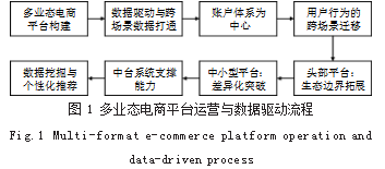 多业态电商平台是融合多种业务形态于统一系统的综合性数字商业生态,其构建突破了传统电商在交易品类和服务场景上的局限,将实物零售、本地生活、数字内容、即时配送等多样化业态集于一体,为用户提供高度集成的一站式消费体验。随着数字技术的发展与用户需求的多元演化,平台逐渐形成以账户体系为中心、以数据驱动为基础的统一运营架构,实现了跨场景数据打通与服务协同,多业态电商平台运营与数据驱动流程如图1所示。市场层面,头部平台通过拓展生态边界和技术整合,不断渗透到更深层次的生活服务领域,构建完整的消费闭环;而中小型平台则借助地域特色、垂类资源或社群影响力在细分市场中寻求差异化突破。在运营机制上,主流平台依托中台系统构建统一支撑能力,将用户画像、推荐算法、支付系统等基础服务模块化输出,支持多业态协同发展[1]。