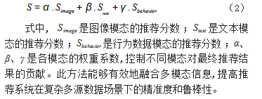 多模态融合技术通过图像编码器、文本表示模型与行为序列网络融合,构建统一的多模态表示空间,提升电商平台的推荐准确性。对齐误差控制在5%以内,确保推荐结果一致性。在冷启动场景下,点击率提升超过20%,系统支持模态异步更新与在线推理,保证推荐质量与实时响应。为了有效融合不同模态的特征,通常采用简单的加权平均法计算最终推荐分数,计算公式如式(2)所示: