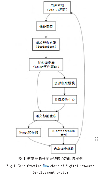 系统架构采用三层分布式微服务模型,上层为前端展示与交互接口,中层为语义解析与任务调度引擎,底层为数据处理与存储服务,核心功能流程图如图1所示。在功能布局方面,系统集成了资源自动抓取模块、异构数据清洗中心、语义标签生成引擎、版本管理组件以及动态内容调度单元。前端基于Vue框架实现模块化UI加载,支持JSON-LD结构数据的可视交互;中间件采用基于SpringBoot的异步通信机制,单任务最大并发量支持240次/秒;底层数据模块集成MongoDB与Elasticsearch,支持PB级资源的分布式存储与全文索引。任务调度引擎融合基于CRON表达式的资源轮询机制与事件驱动式触发策略,实现95ms内响应高并发内容处理请求,确保数据资源在多任务高耦合状态下仍具稳定性与高可用性[2]。
