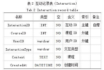 数据库设计采用关系型数据库模型,主要包含用户表(如表1所示)、课程表、资源表、互动记录表(如表2所示)等。用户表存储用户基本信息及权限;课程表管理课程信息和排课数据;资源表存储教学资源信息;互动记录表记录课堂互动数据。