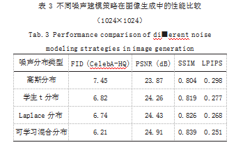 从表3可以看出,可学习混合分布在各项指标上均优于传统高斯模型,FID降低1.24,LPIPS下降0.047,说明其对复杂噪声结构具有更强的建模能力,提升了生成图像的感知真实度与细节表达能力。